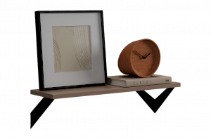 Полка крепится к стене с помощью чёрных треугольных держателей, которые обеспечивают устойчивость и долговечность. Особенность модели в том, что держатели можно расположить сверху, снизу или один сверху, другой снизу, что позволяет адаптировать полку под любые интерьерные решения и потребности.