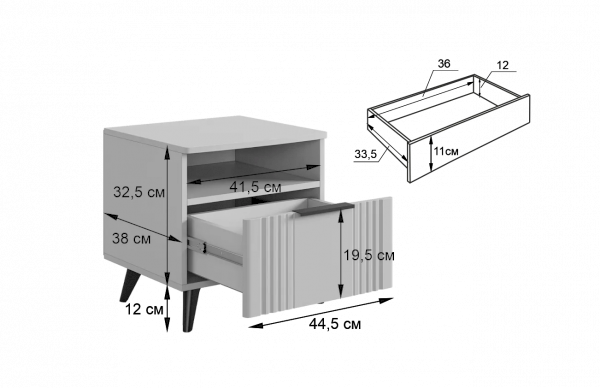 Благодаря компактным размерам тумба легко впишется в любой интерьер и гармонично сочетается с другими модулями спальни «Катрин». Выкатной ящик на шариковых направляющих обеспечивает удобный доступ к вещам, а нерегулируемые пластиковые опоры гарантируют стабильность конструкции.
